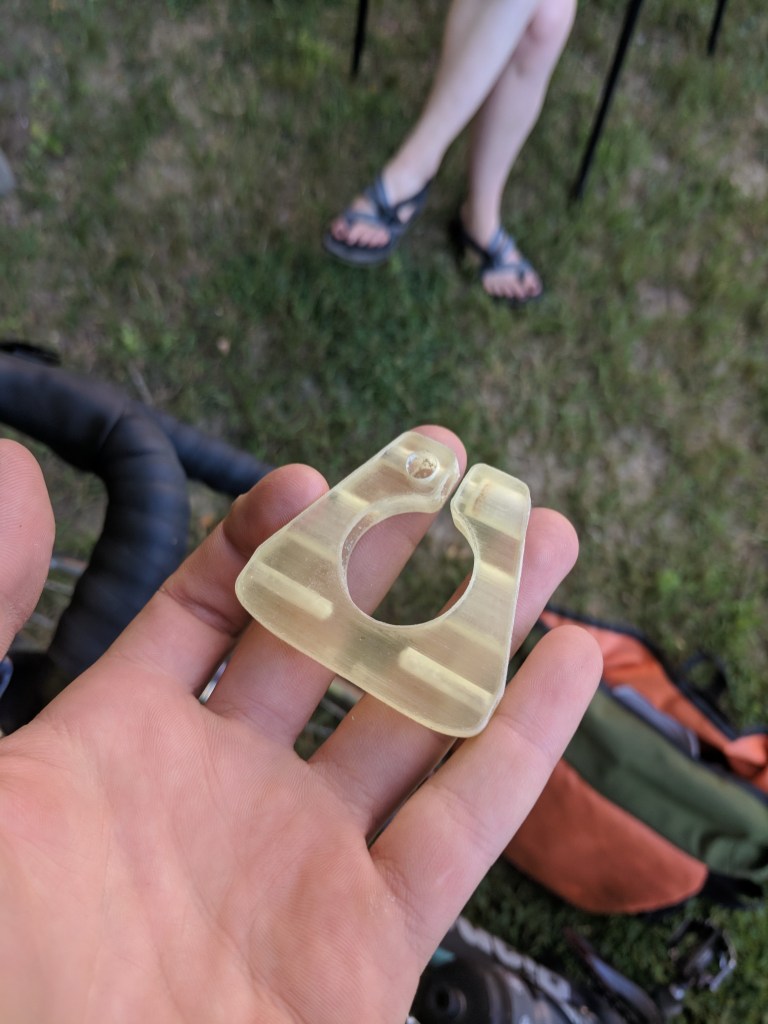 A seat post clamp with two extra threaded holes for mounting a rear bicycle rack. Brass nut slip fits into the clamp, designed to fail instead of aluminum body. 3D printed prototypes, and mistakenly backwards milled iteration also shown.