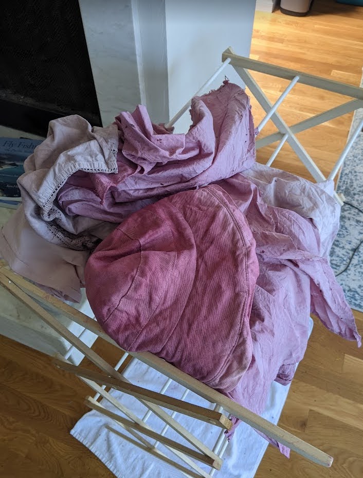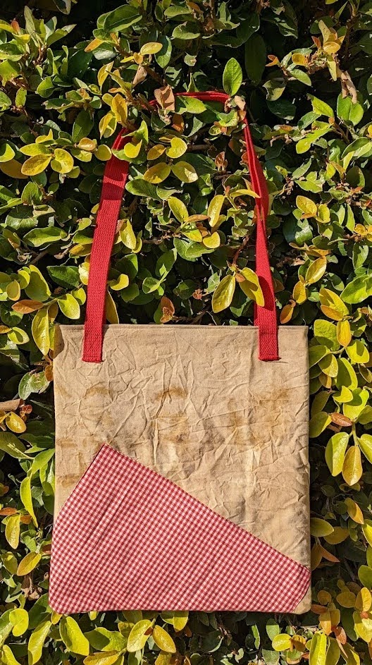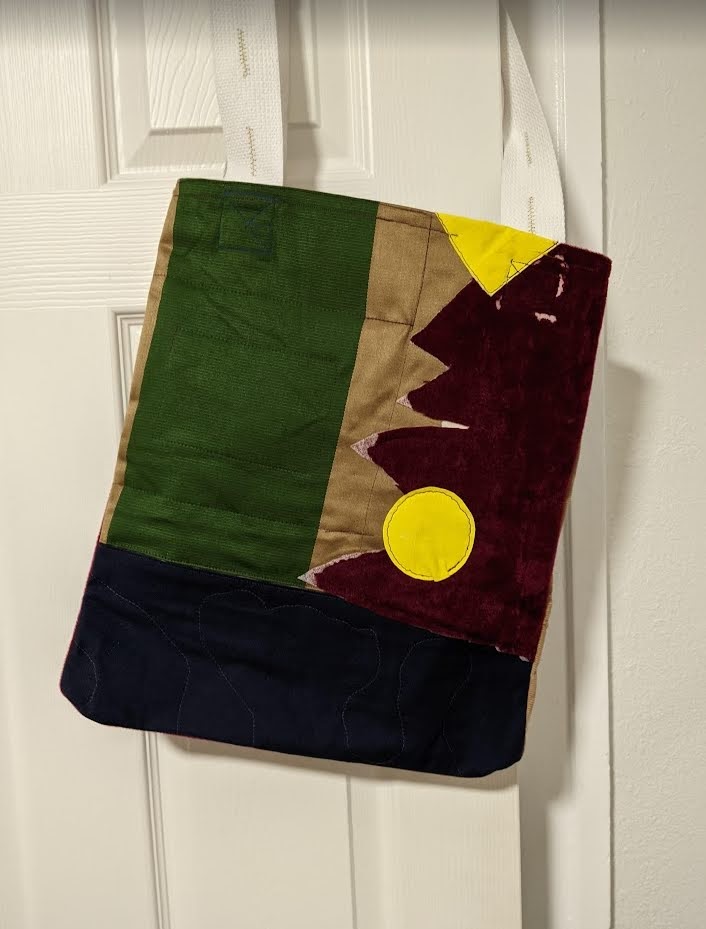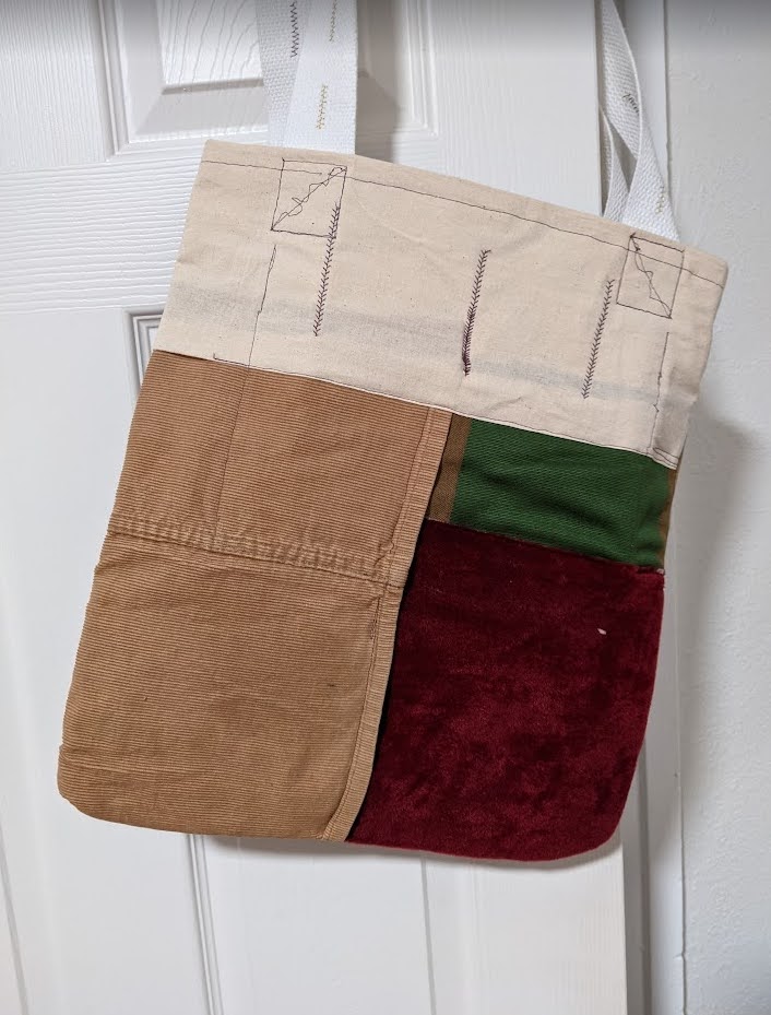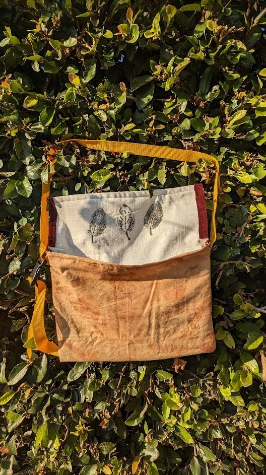 A series of tote bags and musettes I made after buying a sewing machine during COVID in San Francisco. I used recycled fabric for these bags including old corduroy pants and painters canvas. Some of the fabric was naturally dyed using blackberries I found on the hillside near my house. I also incorporated some ink printing of leaves found nearby. For the musette I used a punch to install a metal button, and a plastic buckle for the three point strap.