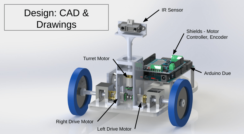 The final project for ENGS 147 was to develop a self driving robot to navigate a field of random obstacles from known start and end points. The prompt for this class was very open, we were free to choose all components ourselves and develop our own machine architecture. Our team went with a simple design with a 3D printed chassis, Arduino Due controller, and cheap DC motors, and an IR sensor.