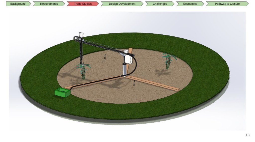My final project at Thayer was a year long endeavor to optimize the FarmBot, an open source CNC backyard farming machine. Our team started from the bottom up looking for ways to simplify costs, design, and function. We performed a mechanical redesign with emphasis on Design for Manufacture techniques, fabricated our own prototype, performed weather & field testing, and completed market and sales projections. Our final product had an 88% part count reduction and 70% cost reduction compared to the benchmark design.