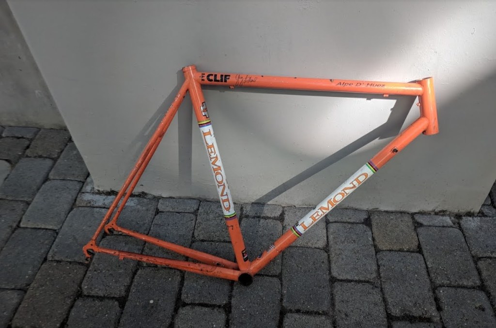 After becoming a member at the bike kitchen in San Francisco, I found this old Lemond Alp d’Huez frame in the trash. When I asked about it, they told me it had a hairline crack on the down tube near where it hits the head tube. I took it upon myself to fabricate a gusset and save the frame. This bike became my mind basket bike for getting around the city and running errands. The repair seemed to work great, I had no issues and got tons of enjoyment out of this bike.